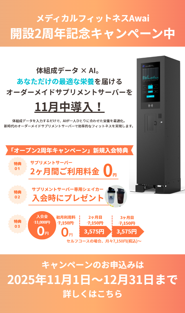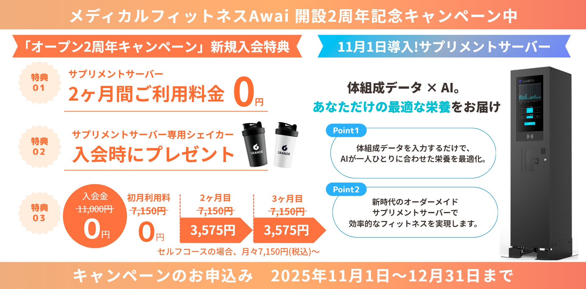 - Awai Hero Awards 2025 (セミパーソナルコース懇親会&表彰式)11月1日をもちまして、野崎徳洲会メディカルフィットネスAwaiは2周年を迎えました! 昨年には引き続き、今年… 続きを読む: Awai Hero Awards 2025 (セミパーソナルコース懇親会&表彰式)
