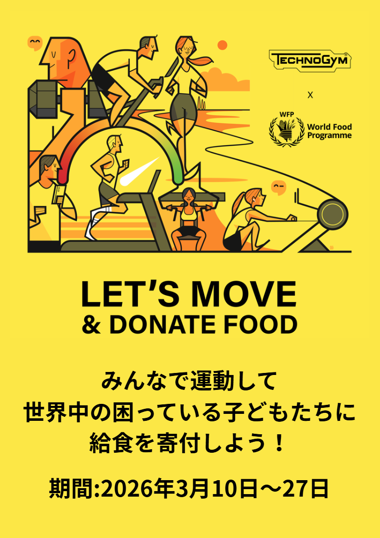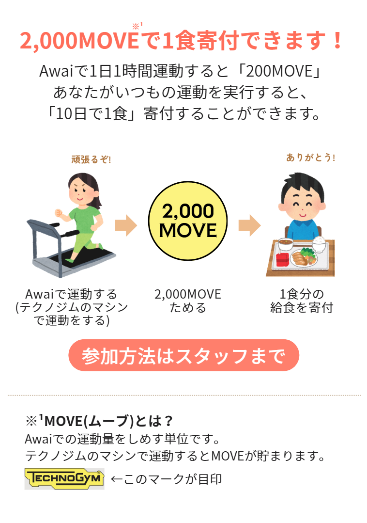 イベント内容:テクノジムマシンで運動を実施し、2,000MOVE貯まると1食分の寄付ができます。